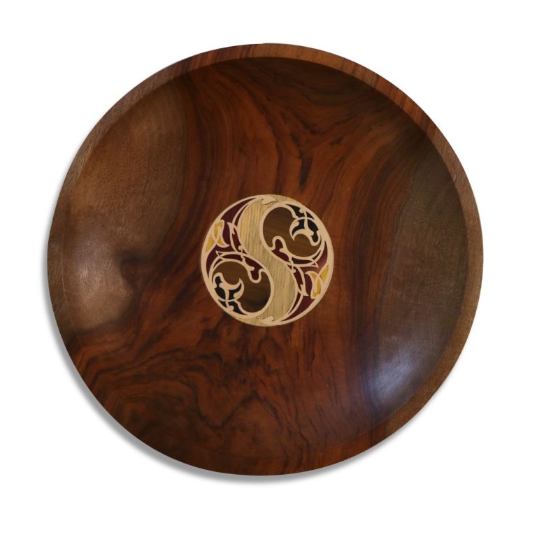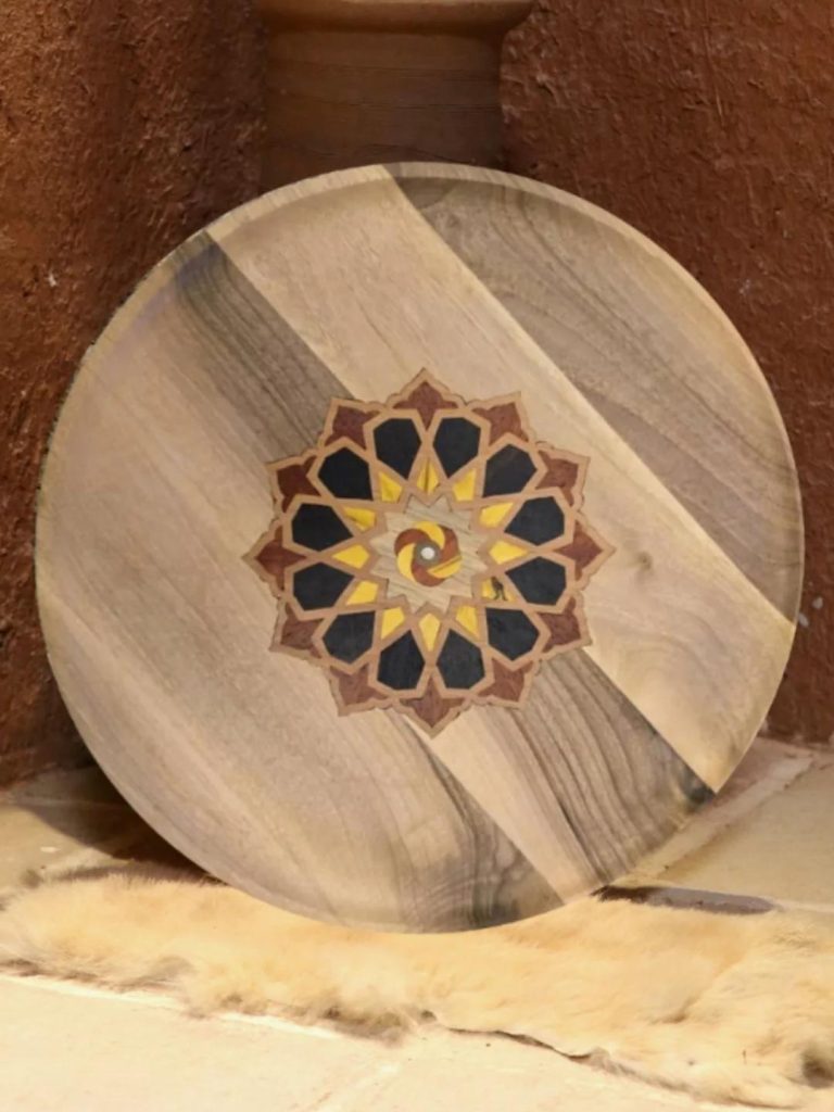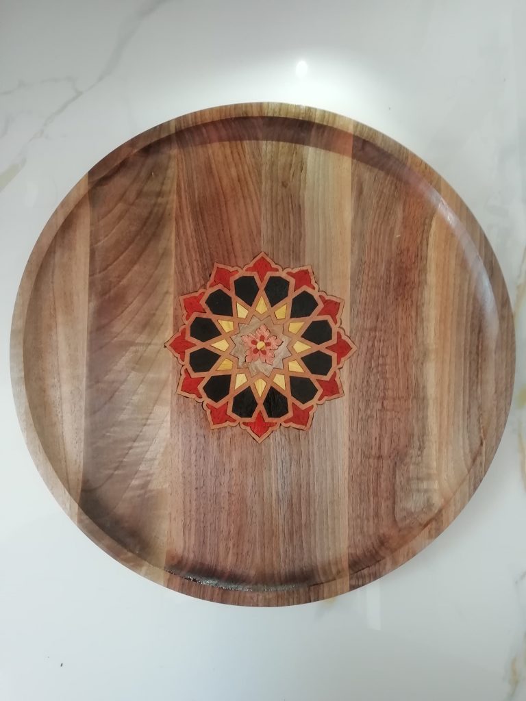 این سینی چوبی معرق، با طراحی هندسی چشم نواز در مرکز ، ترکیبی از اصالت و مینیمالیسم رو به نمایش می گذارد. رنگ های زنده ی قرمز، مشکی و زرد در کنار چوب طبیعی، جلوه ای خاص و متفاوت به این اثر بخشیده است.