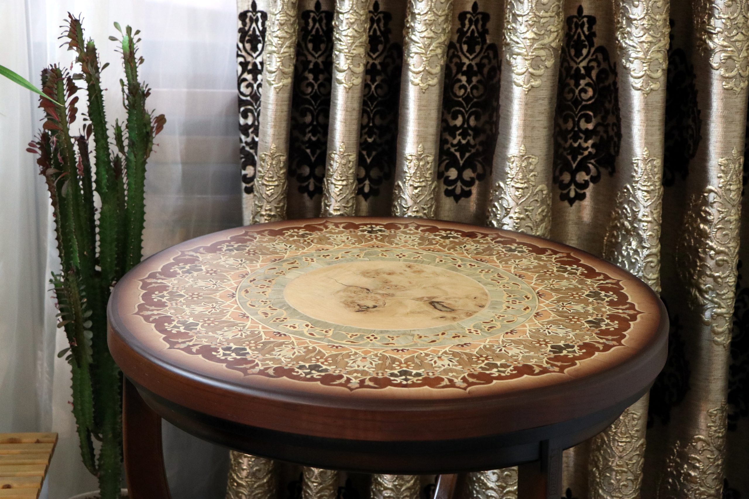 میز معرق «منظومه» همچون نقشی از کیهان با چینش هنرمندانه ی تکه های چوب رنگارنگ، تصویری از هماهنگی و بی نهایت را پیش چشم می نشاند.